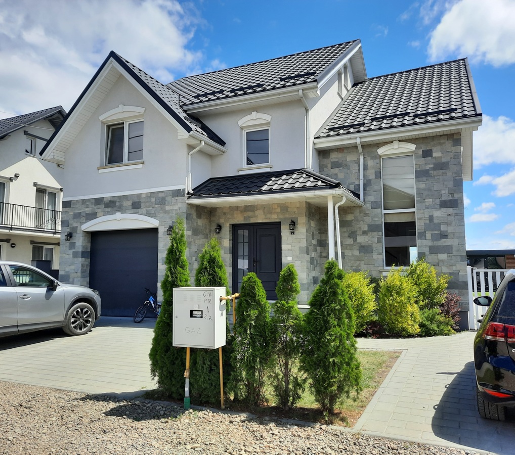Casă nouă în Rădăuți, 173 mp, construită din lemn tip framing, izolată cu vată bazaltică și polistiren de 12 cm, acoperită cu tablă tip Lindab, la exterior placată cu piatră naturală și tencuială decorativă, centrală termică pe gaz cu boiler încorporat, la parter este încălzire în pardoseală, la etaj sunt calorifere