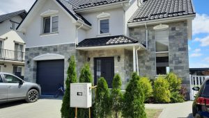 Casă nouă în Rădăuți, 173 mp, construită din lemn tip framing, izolată cu vată bazaltică și polistiren de 12 cm, acoperită cu tablă tip Lindab, la exterior placată cu piatră naturală și tencuială decorativă, centrală termică pe gaz cu boiler încorporat, la parter este încălzire în pardoseală, la etaj sunt calorifere – parter: living, dining